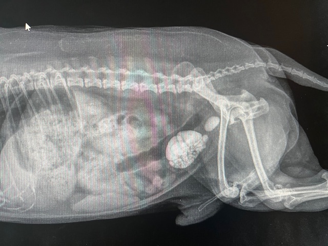 De blaas zat volledig gevuld met talrijke blaasstenen en bovendien zat er opnieuw een steentje vast in de urethra, waardoor de urine niet meer kon passeren. Ondanks de eerdere urethrostomie had een steen zich toch op een ongunstige plaats vastgezet, met opnieuw een levensbedreigende situatie tot gevolg.